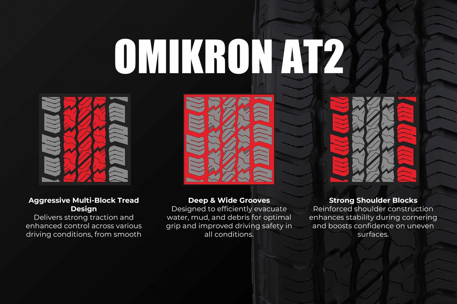 The Omikron A/T 2 comes with several key improvements, including a more aggressive tread design that enhances traction across various surfaces. Its deeper grooves are engineered to evacuate water and debris more efficiently, while reinforced shoulder blocks provide added stability and durability, especially when driving on uneven terrain.